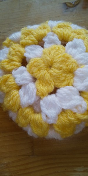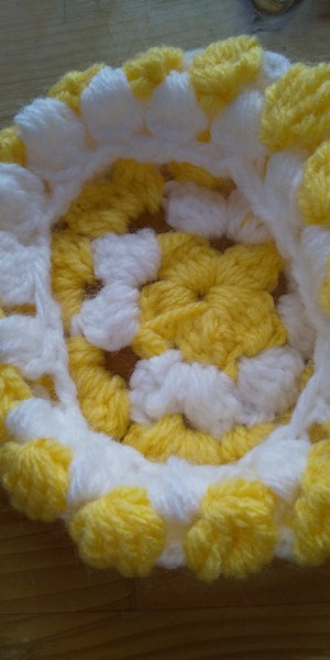 YouTubeを見て小物入れを作りました。黄色と白の余り毛糸で楽しく短時間で編めました