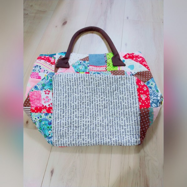 クレイジーキルトのバッグです。肩から掛けれるようにもう少し持ち手を長くしたら良かったと思いました。たくさん残っていたハギレが活用出来ました。