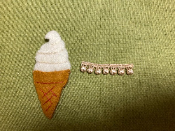 ソフトクリームのブローチです。目玉のブローチを作っていて、ちょっと可愛いものも作りたくなりました。