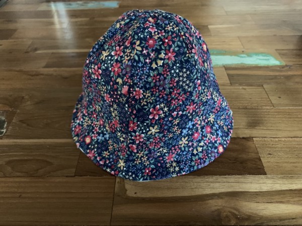 ベビーのチューリップハットを作りました。サイズは44センチで、お花柄と無地の生地を合わせてリバーシブル仕様にしました。