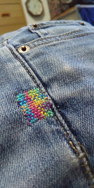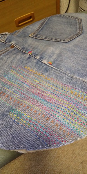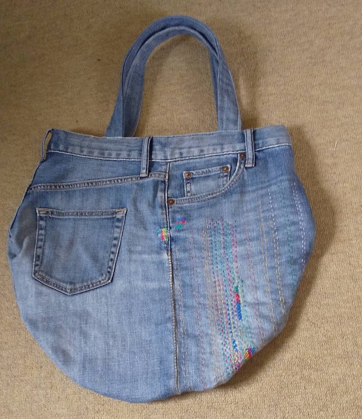知人が大事にしていたジーンズをバッグにリメイクしました。傷んだ部分はダーニングや刺し子をしました。