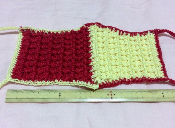 | コットンのレース糸で、かぎ針編みのマスクを作りました。 ワッフル編みでポコポコした編み地になっています。耳にかける紐もレース糸です。 黄色が残り少なかったので、同じ太さの赤い糸を使いました。 あまりにも派手すぎて悪目立ちしそうで、外にはつけていけない…というか、これ一枚では感染対策にならないので、どっちにしろ外ではつけられないのですが。練習だからいいのです(^_^;) |