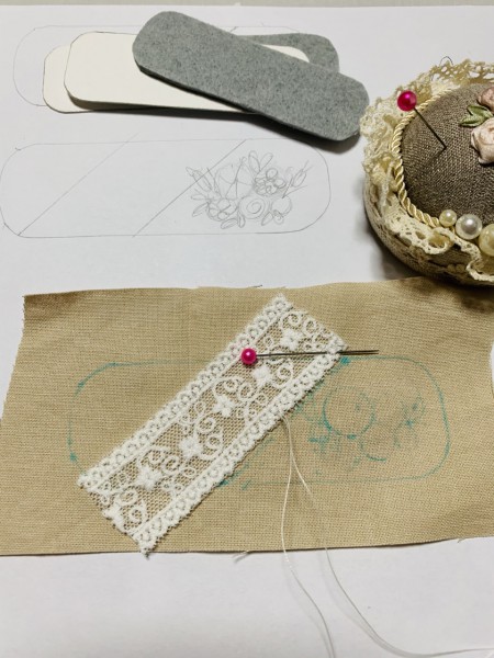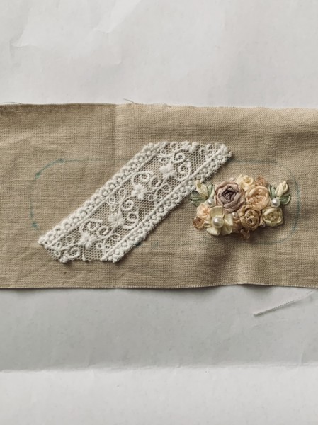 レースのリボンを選んでから図案を考えて、リボン刺繍をしました。娘の好きな色味でビーズも入れました。