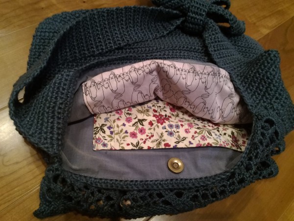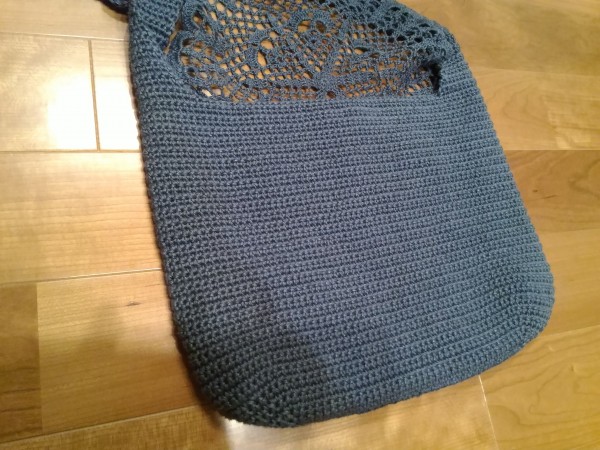 | ショルダーか斜めがけのバッグです。ひもは結んでありますが、後で縫い付けて固定するかも。 1本取りでドイリーを編み、後ろ側をまつりつけて蓋がわりにしました。 中ははぎれでポケットを作り、マグネットボタンを付けました。 |