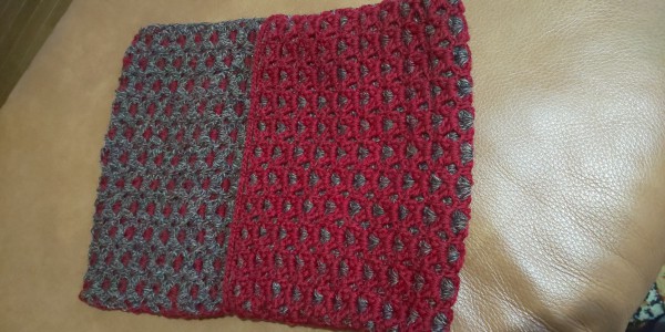 リバーシブルクロッシェ2の編みかたに初めて挑戦したものです。四角に編んで三つ折りするだけの簡単な物です。