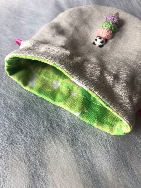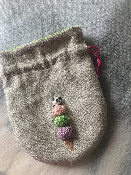 | 立体刺しゅうの2作目。今回は、下のコーンから上に向かって刺してみました。上から刺すのと、特に違いはなかったかな。 内布は、アイスの緑に合わせてミナのプリント生地に。 ステッチの目を揃える事、注意したつもりだけど目数を減らしていくときに曖昧になりがち。次の課題。 巾着の縫い代を、毎回アイロンでしっかり割って巾着の輪郭をはっきりさせて仕立てると、周囲がもたもたせずにキレイに仕上がりました。 返し口は、ぐしぬいに。 |