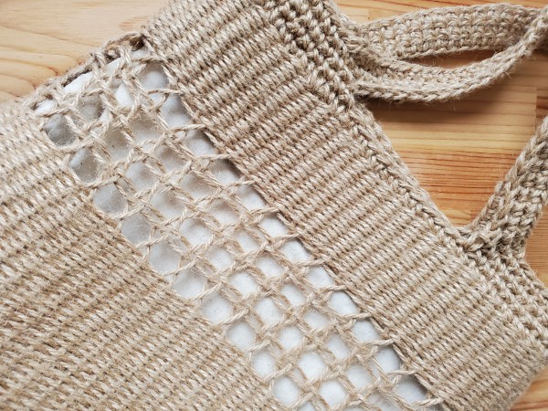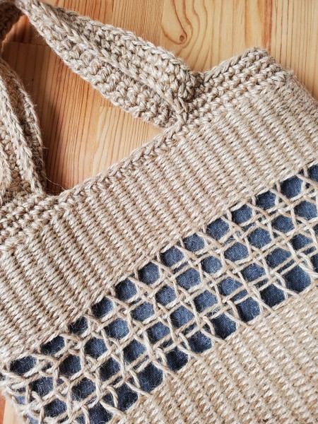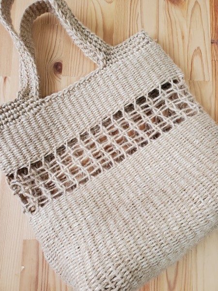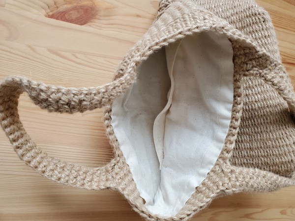 持ち手をこまあみで編みました あとはポケット付きの内布をつけます