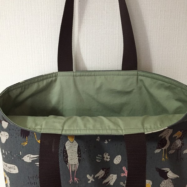 大きめのショルダーバッグ。荷物が多い時用に合わせて作成。全部ハシビロコウさんの生地だとのっぺりしそうだったので、下の方は無地で切り替えました。