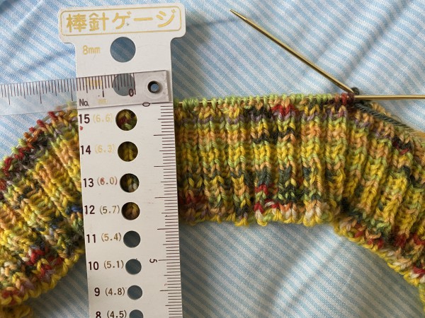 一旦ここで縦ゲージを数えてみたら、編み図のゲージと全然違うことに気が付きました。まあ、横ゲージだけ合ったことを確認してスタートしていたので想定内です。