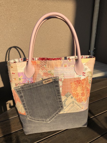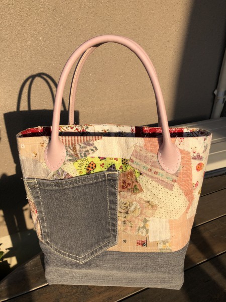 着古したジーンズと、パッチワークで出たクズ布でトートバッグを作りました。