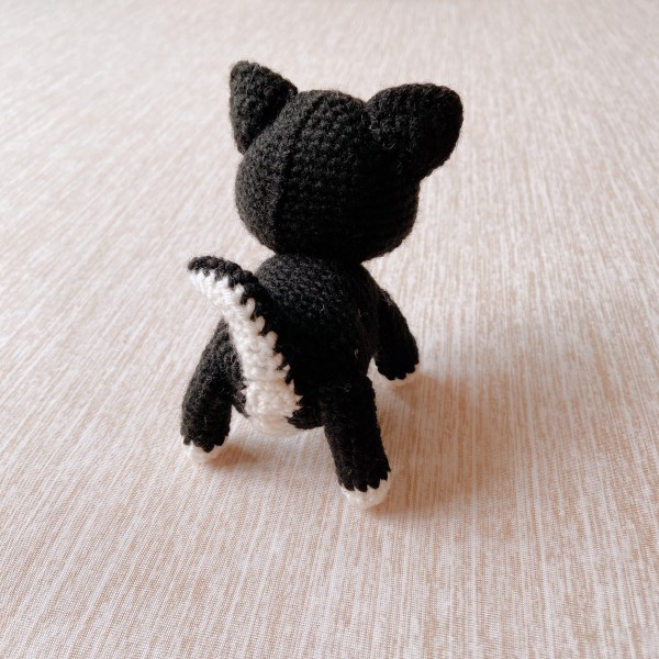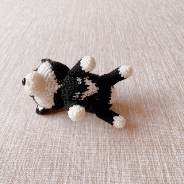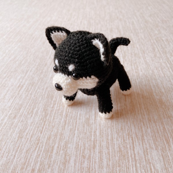 | 黒柴わんこです。黒柴は初めてでいろいろ悩みました。お腹の毛の生え方がわからず画像などを参考に再現したつもりが正面から見ると全く見えませんでした。次回の課題です。 目の色も黒の毛糸に黒い目だとわかりにくいと思い、あれこれ試してみましたが、結局8ミリの目だと光が入っていい感じになりました。 |