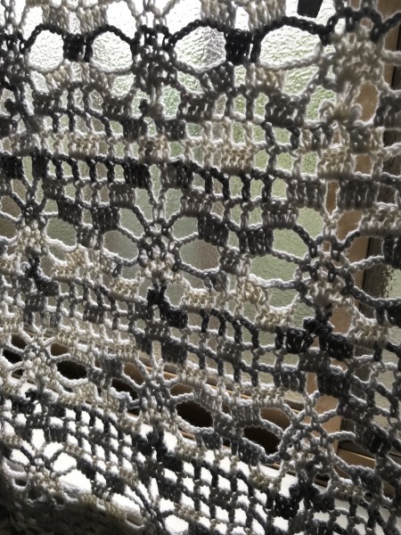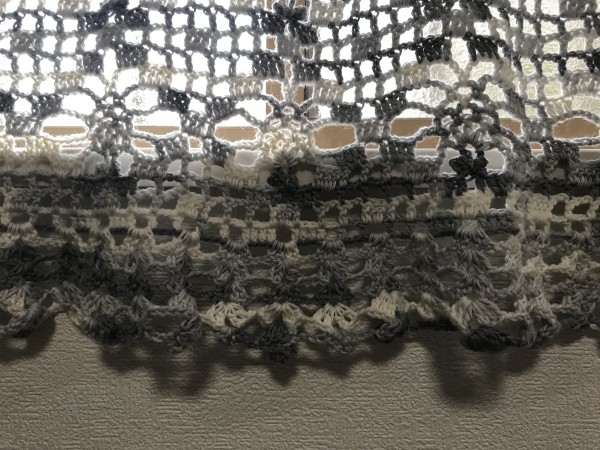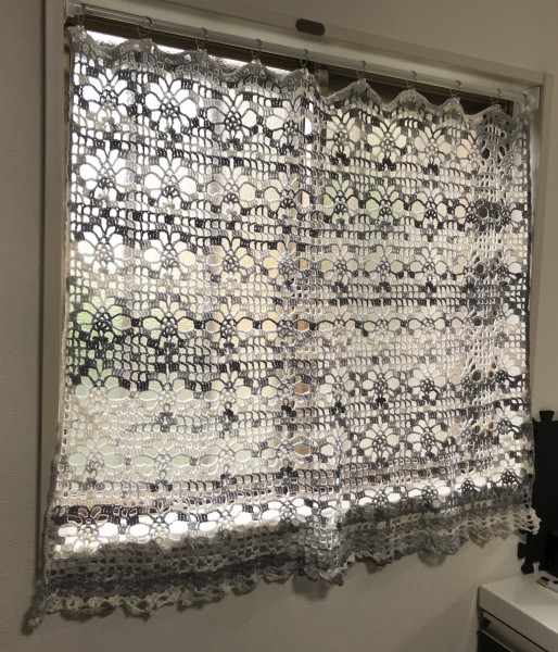 キッチンのカフェカーテンと同じ模様で、コットン糸で編みました。