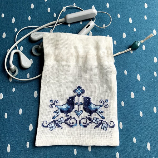 イヤホンを持ち歩く巾着がほしくてつくりました。ブルーのグラデーションがぽいんとです