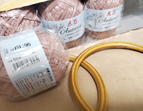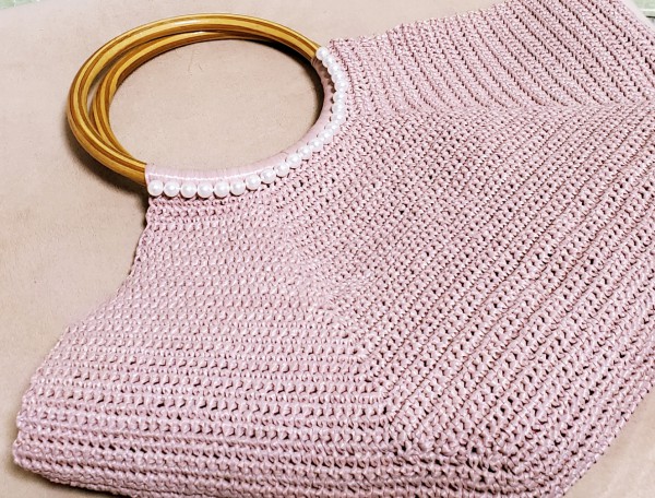 編み図よりちょっと大きめにした。 そしてハンドル周りにパールを縫い付けました♪