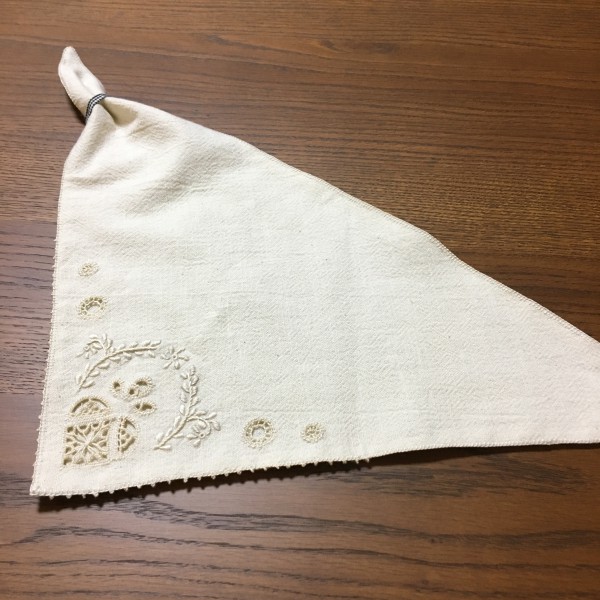 布を三角に折るだけでぴったりサイズ!だけど、装着時に布通すための輪っかを作る分がないので、適当に手元にあったギンガムチェックのリボンをつけて完成ということで!