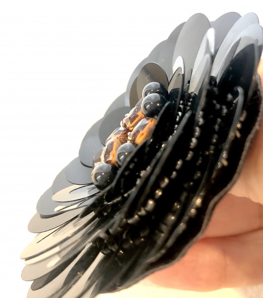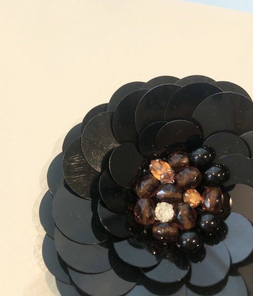 2種類のサイズのスパンコールと、大粒のビーズで作ったコサージュです。花びらが立つように、スパンコールの根本に小粒のビーズを連続刺ししています。