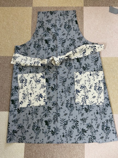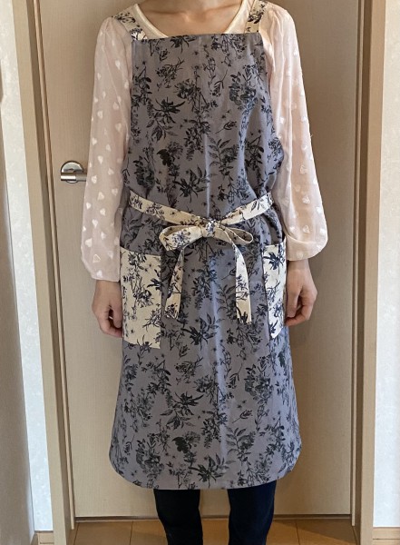 かわいいインテリアファブリックを見つけたので色違いのエプロンを作ってみました。妹へのプレゼントです。