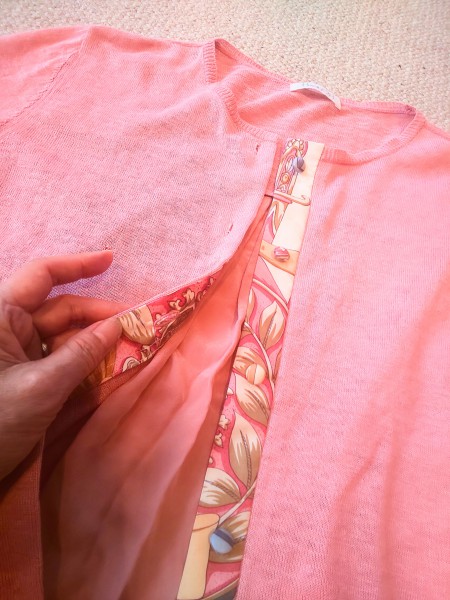 首回りがタイト過ぎて、10年近く眠っていたサマーセーターを前開きに。持ち出しの部分とくるみボタンは、バブル時代から30年眠っていたスカーフを活用。組み合わせたら相性抜群。アイデアが形になるのは、ものすごく楽しいです。