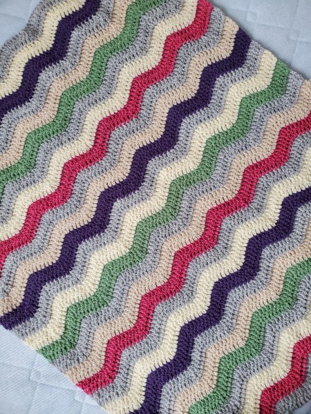 | 今度の波模様は少し太めの毛糸で編んでみようと思います。大きさも前回より大きくなる予定です。 周りをピコット編みにして仕上がりました。 編んでいて色の組み合わせとか楽しかったです。 |