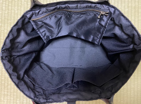 トートバッグを裏返しにして、外ポケットを内ポケットとして使えるようにし、ファスナーをつけたポケットを取り付けて、入り口を閉じることができるようにホックも付け替えました。入り口を縫い合わせました。この後、持ち手をつけて完成にする予定です。