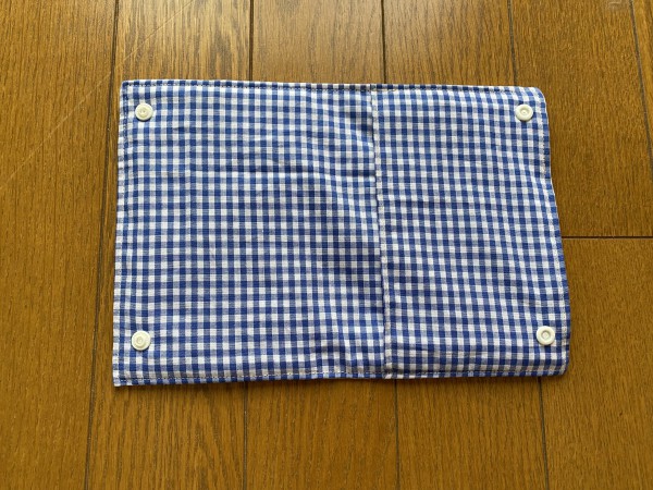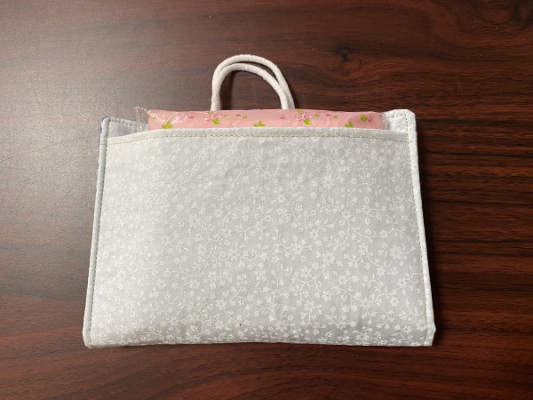 大きくなりすぎず、ティッシュや予備のマスク、小物が入れられるように作りました。表は一枚布で折り畳んでます。