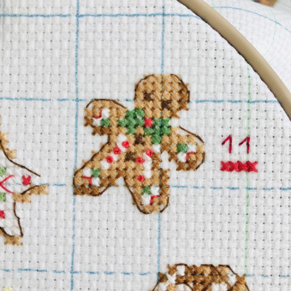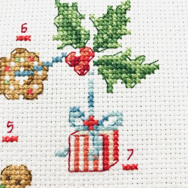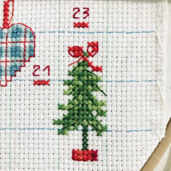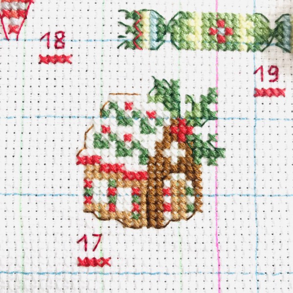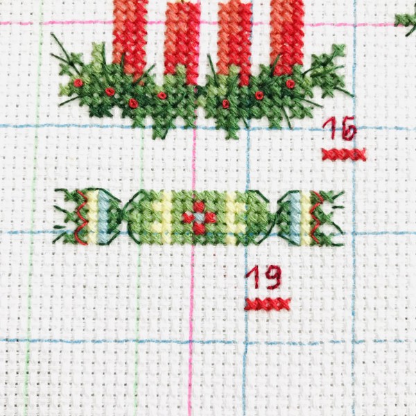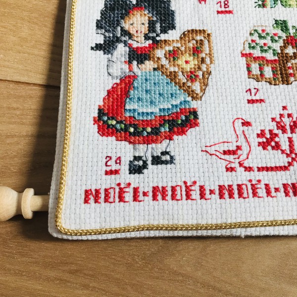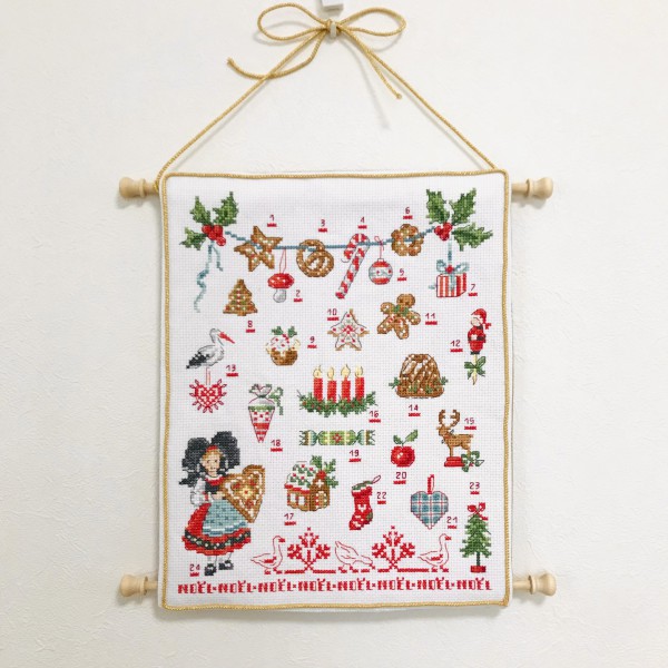 | ヴェロニク・アンジャンジェ著「フランス12か月の行事と遊びのクロスステッチ 」より クリスマス 刺繍した後に接着芯を貼り、裏布を付けました。 刺繍面の周りに金色の紐を縫い付けています。 アドベントカレンダーになっていて、小さなモチーフが24個あります。 |