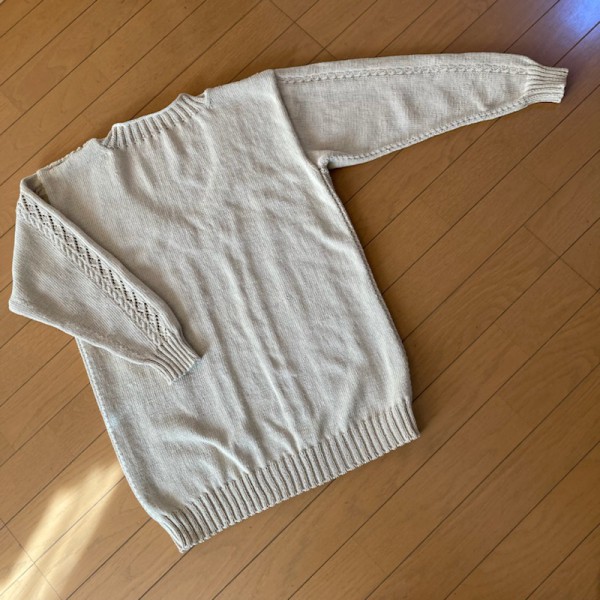 | コットン糸で編んだセーターです。あまり寒くなってからでは着られないので、あせって編みました。着丈が約66㎝と少し長めです。 前後身ごろを肩で綴じて、身ごろから直接 目を拾って袖を編みました。袖口と裾は二目ゴム編みを綴じ針でとめてあります。襟ぐりは3目2目のゴム編みで綴じは かぎ針で引抜き編みを2周してあります。 |