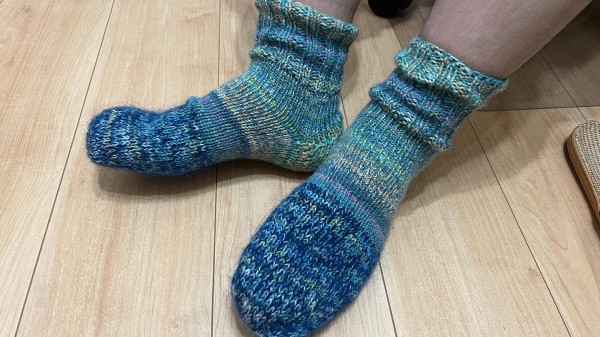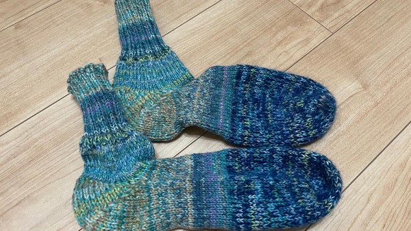 輪針でソックス3足目、夫様に作りました。夫の足は鍛えまくってるので太すぎてキツいらしいです。人の靴下はサイズが難しいです。でも暖かいと言って喜んでくれました。