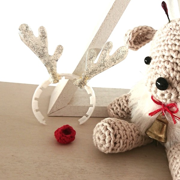 | 赤鼻のトナカイさん…? 実はコスプレ。 サンタさんの橇をひくのが夢のトナカイの子どもです。 ネットでトナカイの赤ちゃんの画像を見て、あんまり可愛いのでつくってみました。小枝のような角がキュートでした。 付け角のカチューシャの部分はペットボトルの首のところについている輪を切って使っています。 以前どなたかのブログ(?)でリカちゃんのカチューシャの作り方として紹介していらしたのを真似させていただきました。 赤い鼻カバーを付けるために黒い鼻(差し目)は少し浮かして付けています。 |