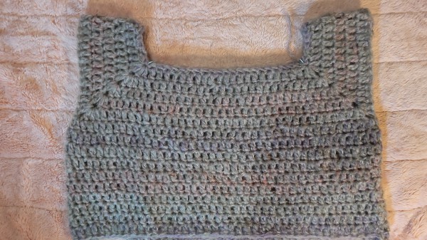 襟首が何だかユルユルで、細編み5段編んでも前屈みになったらお腹まで見えそうなので、長編み編み足してから、伸び止めの細編みしました。