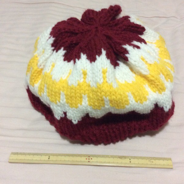 | ギザギザ模様のニットキャップ、第2弾。 今度はちゃんと自分でかぶれるように、太めの糸で大きめに作りましたが、 頭頂部にさしかかったところで糸が足りないかも!?と心配になって焦って閉じたら、浅くなってしまいました…… |