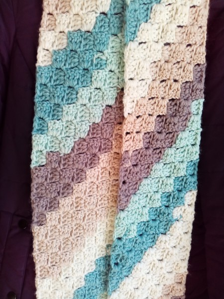 色変わり毛糸の配色に一目惚れして、ダイアゴナルステッチでマフラーを編みました。