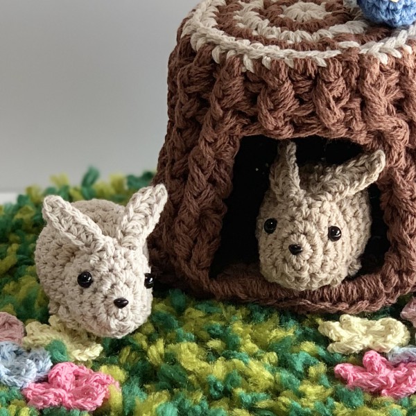知人へのプレゼントで作りました。初ジオラマです。ここにはまだ載せてないのですが、以前編んだ女の子の編みぐるみに合わせて森の仲間たちを作りました。