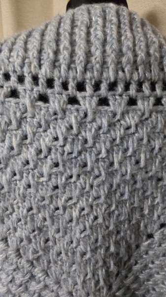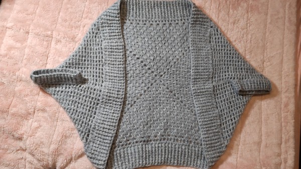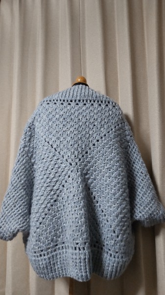 縦60センチ位、横110センチくらいなったので、これから袖をまつって、袖と裾を引き上げ編みで、前たてをすじ編みで編んでいこうと思っています。