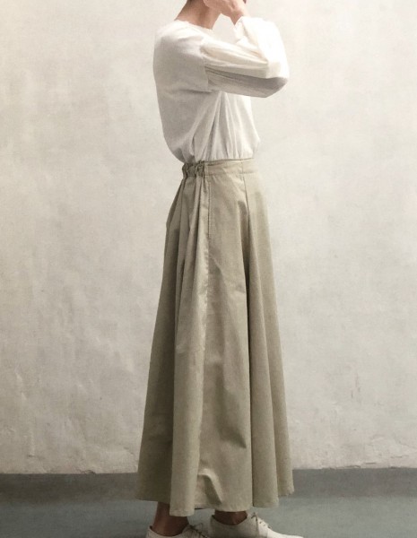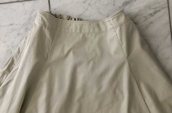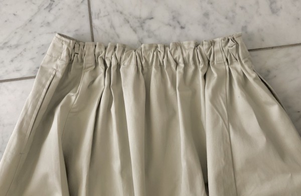 裾のフレアをキープできる仕様です。ウエストは後ろゴムだから、前はスッキリ見えます。