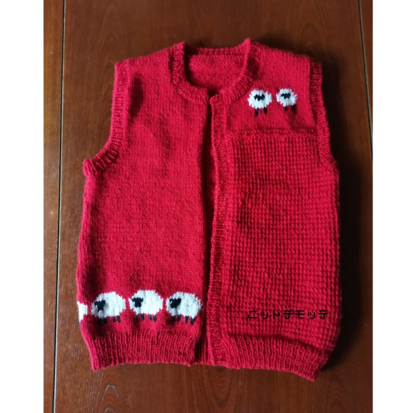 | 無事に還暦を迎えられた記念に初心に返るという意味も込めて自分で紡いだ糸でオリジナルデザインの赤のベストを編みました。 羊さんの編み込み模様も気に入っています。 |