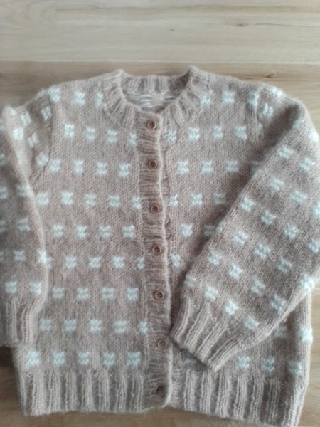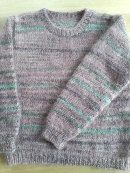 虹色のセーターはトレーナーみたいにラグラン袖にしました。半袖のセーターはカーディガンとセットのはずでしたが出来ていません。昔はフリースなんて無かったからセーターを日常着ていたなぁ…。