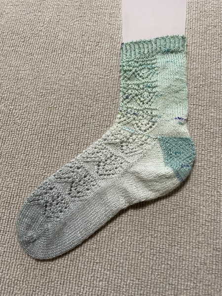 踵部分を編んでから休めてた甲を編むのでそうなってしまうと、後で気がつく。