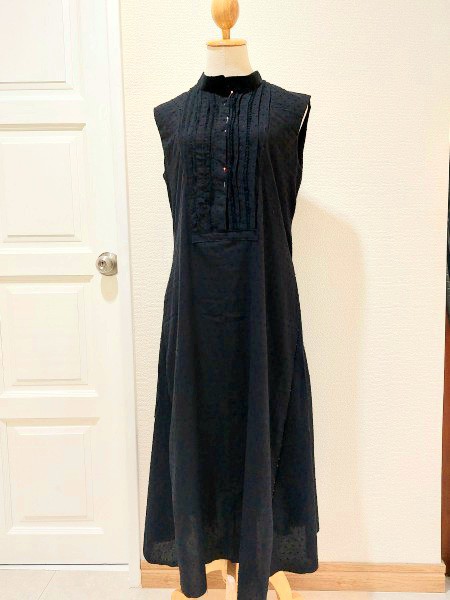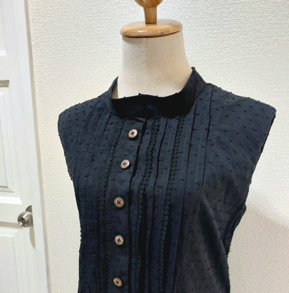 | 胸にピンタックが入ったノースリーブワンピースです。 以前に洋裁教室で作ったワンピースのおさらいで別布で作り始めました。 ピンタック部分と袖が難しかったです。 |