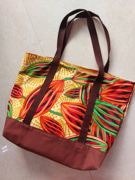 アフリカ布で大きなトートバックとポケットが両サイドについたバックを作りました。