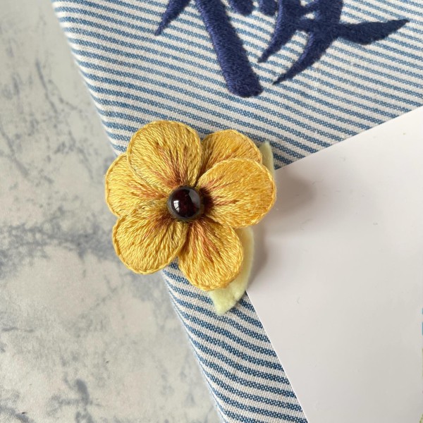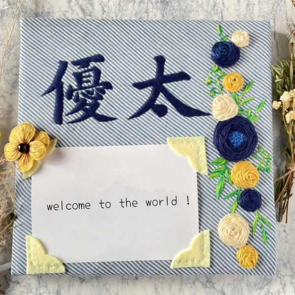 写真の左上にある立体刺繍の真ん中には誕生石のガーネットをあしらいました。