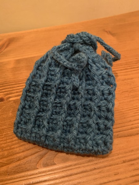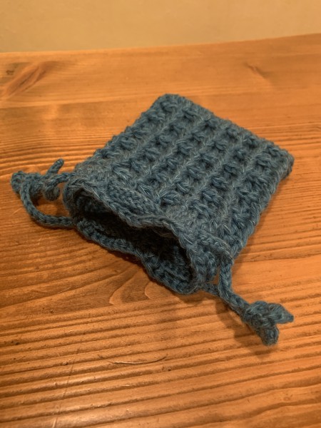 ワッフル編みでぺったんこタイプのミニ巾着。