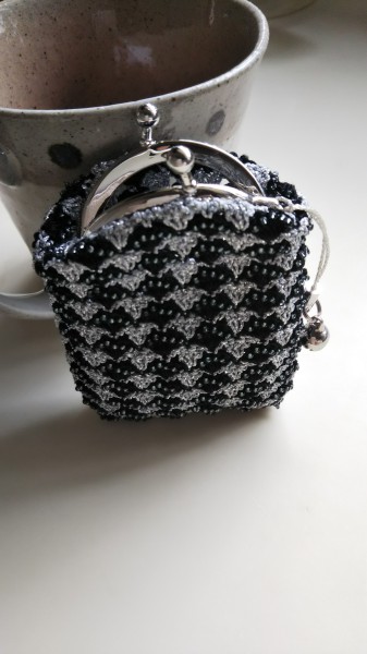 ビーズを通した黒と、シルバーで模様編みにしました。