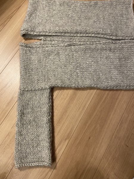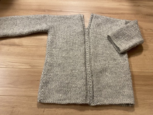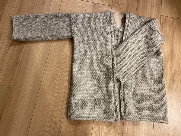 [MOORIT これが編みたい]のまっすぐ編む2本どりセーターのカーディガン版を参考に、毛糸やゲージなどは替えて作りました。超極太の毛糸1本どりでまっすぐひたすら編むので意外と早く仕上がりました。