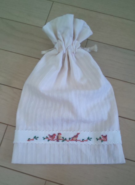 | 昔購入していたFELISSIMOのクロスステッチテープの会キット(今はないと思うけど…)やっと作れました。 テープなのでタオルやポーチなど、何につけても良いのですが御朱印帳入れ用に巾着型ポーチにしました。 テープにするクロスステッチは小さい柄になっているので糸の色を間違えないように注意しながら刺しました。なかなか可愛い巾着になったと思います。 |