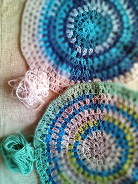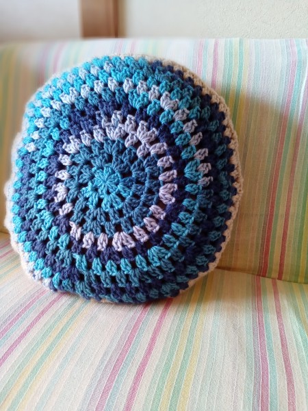 はじめてグラニーサークルに挑戦しました。編み方が一定でないため、編み進めるうちにひだができてしまいましたが、クッションを入れたらなんとか形になりました。