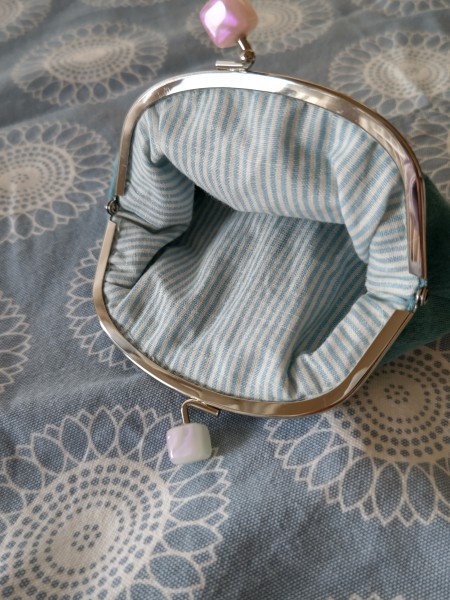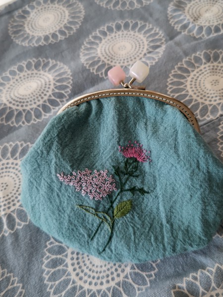 がま口ポーチです。カーネーションやアザミ、あじさいなどを刺繍しました。