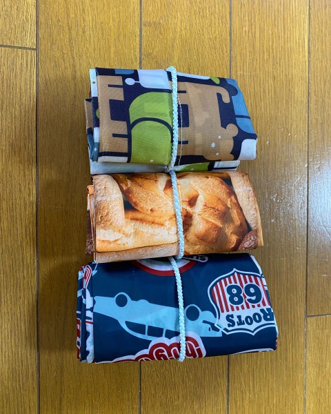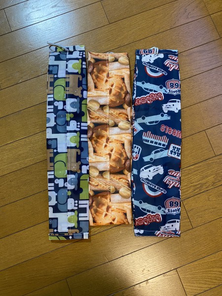 残っていたナイロン生地で作ったのでサイズまもバラバラです。持ち手部分はそれぞれ変えてみました。