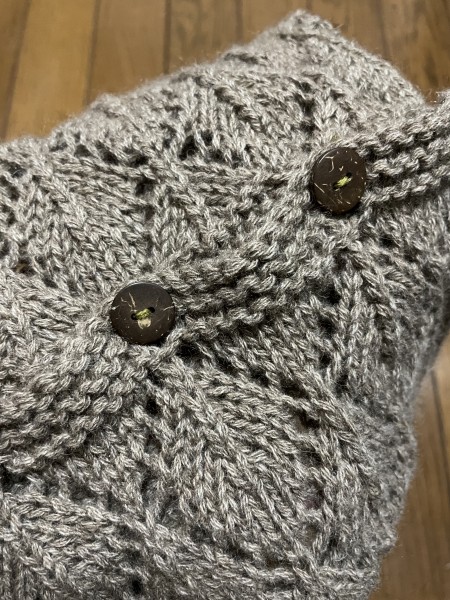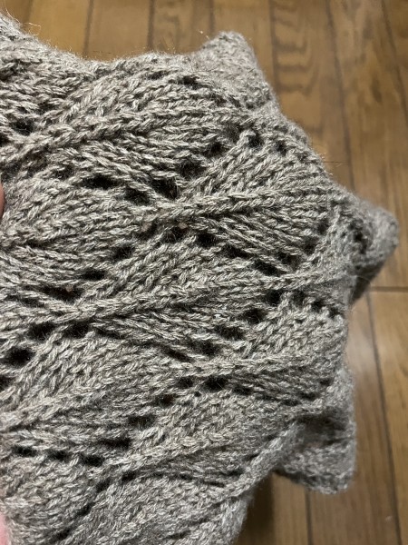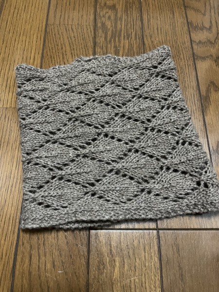 リャマ100%の珍しい毛糸でスヌードを編みました。木の葉模様がとっても可愛いです(^^)