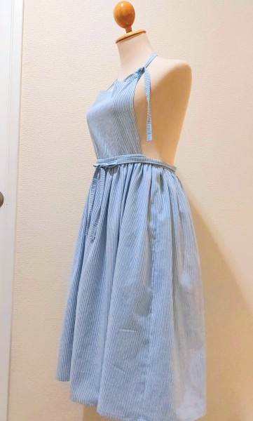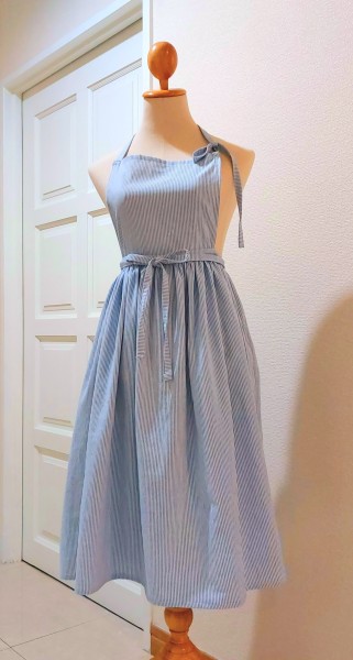 | 友人へのプレゼント用エプロンドレスの試作。 このボディのようにスリムならふんわり広がってカワイイデザインですが、ウエスト周りがギャザーで強調されるためもう少しギャザーを減らしてスッキリするように改良が必要 YouTube 「ミニマルchanの暮らし_元デザイナーのsewing channel」参考 動画では極薄生地を使用していた為、生地によっても雰囲気が変わることを実感 |